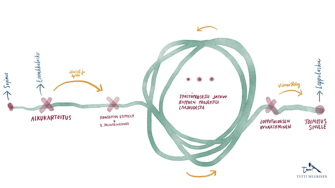 Yhteistyömme alkaa yhteydenotosta, joka ei sido sinua vielä mihinkään. Kerrottuasi minulle mitä tarvitset (ja mahdollisten täydentävien lisäkysymysten jälkeen) lähetän sinulle tarjouksen, joka sisältää muun muassa aikataulun, työn hinnan, projektin kuvauksen ja sisällön. Hyväksyttyäsi tarjouksen sopimus on syntynyt ja ryhdymme töihin.