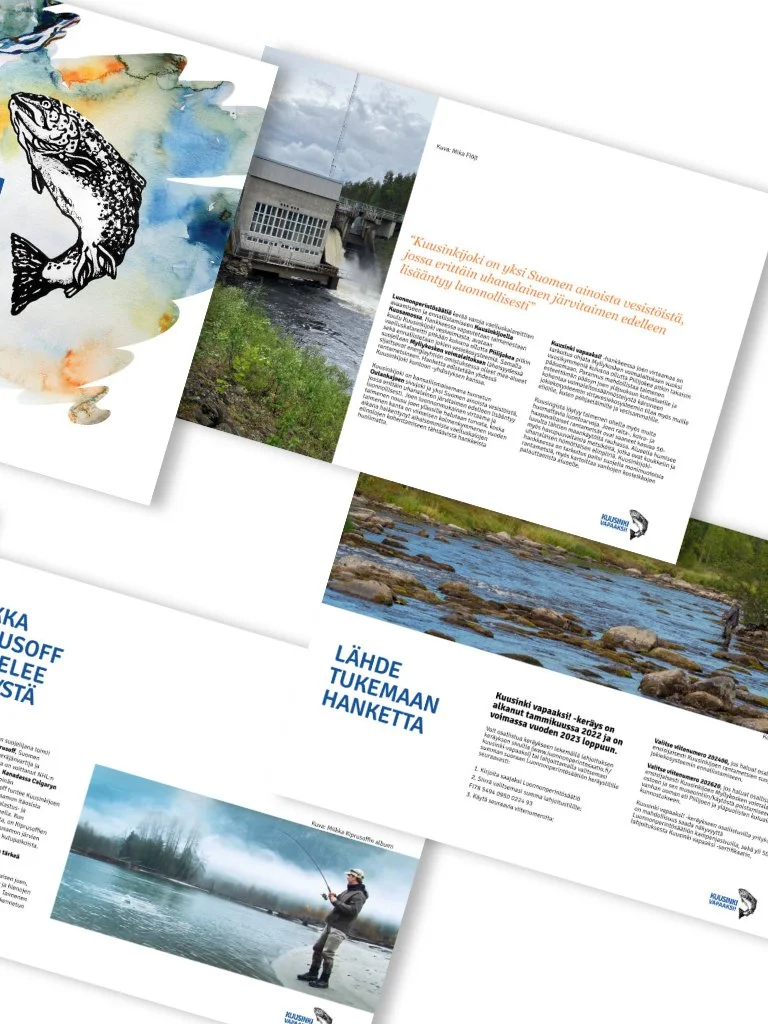 Kuusinki vapaaksi!- hankkeeseen sisältyi useita taittotöitä, kuten digiesitteen taittaminen ja A4-sertifikaattien suunnittelu. Esitteeseen luotiin myös taittopohja.
