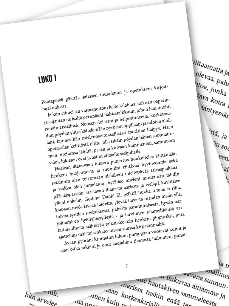 Taitto ei tarkoita vain tekstin juoksutusta sivulta toiselle. Taittajana otan huomioon hyvän luettavuuden, katseen huomiopisteet, tyhjän tilan käytön ja materiaalin kokonaisvaltaisen visuaalisen tasokkuuden ja yhdenmukaisuuden. Unohtamatta brändinne ja ohjeistonne noudattamista, mikäli teillä sellainen on.