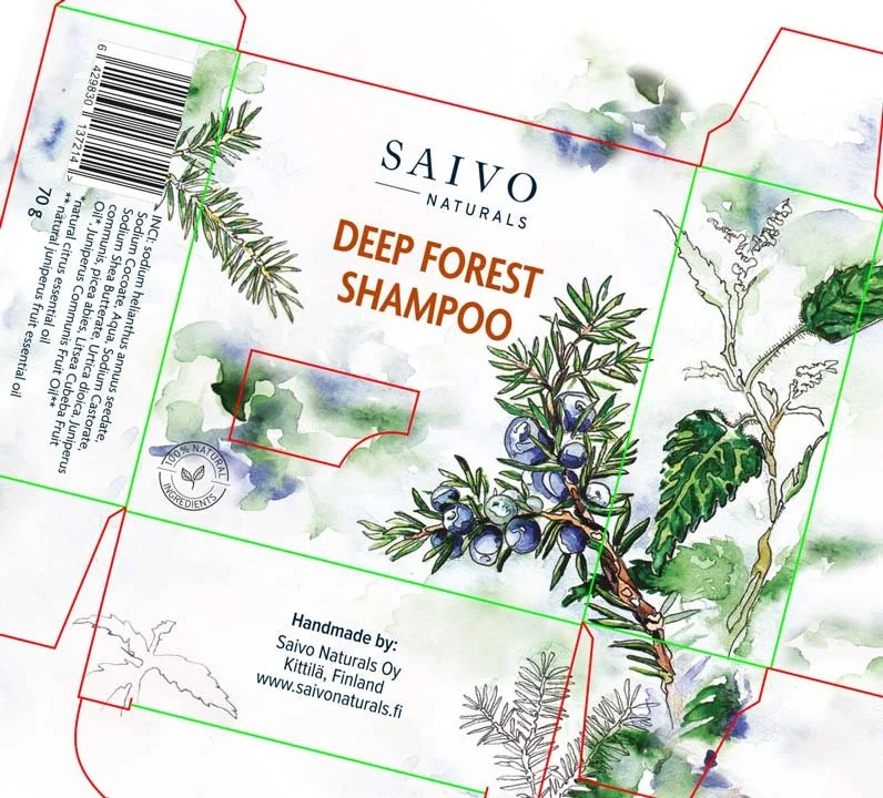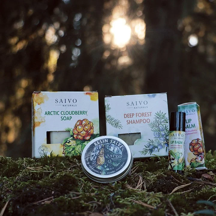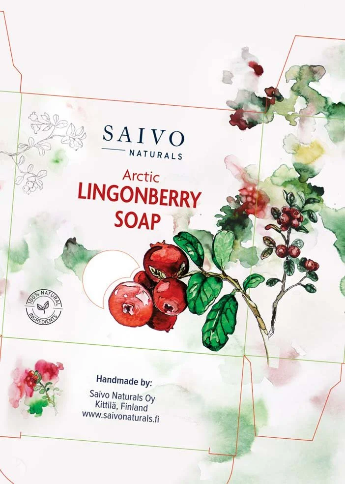 Saivo Naturalsille olen suunnitellut pakkaustuoteperheen, joka koostui alkujaan neljästä tuotteesta: hillasaippuasta, metsäshampoosta, huulirasvasta ja pihkavoiteesta. Myöhemmin sarja on täydentynyt myös uusilla tuotteella. Tavoitteena oli suunnitella pakkauksille ilme, jossa pääosassa on runsas, tuotteen pääraaka-ainetta kuvaava kuvitus. Kuvitus kiertää pakkausta joka suunnalta ja se toteutettiin akvarellin ja kynän sekatekniikalla.